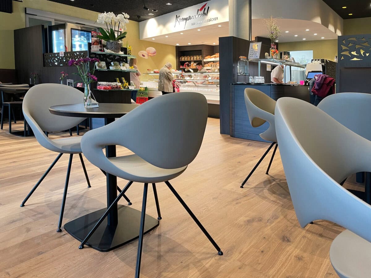 Sorgfältig ausgesuchte Möbel kombiniert mit modernen Materialien sorgen für einen gemütlichen und längeren Kaffeeschwatz oder auch zum Mittagessen.