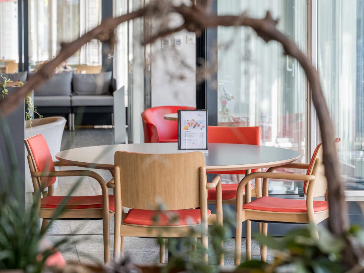 Die gemeinsamen Mahlzeiten gehören zu den Höhepunkten im Alltag der Bewohnerinnen und Bewohner. Sie geniessen das Essen auf den modernen Stühlen an den leicht wirkenden Tischen in Eiche massiv und einem modernen Dekorblatt.